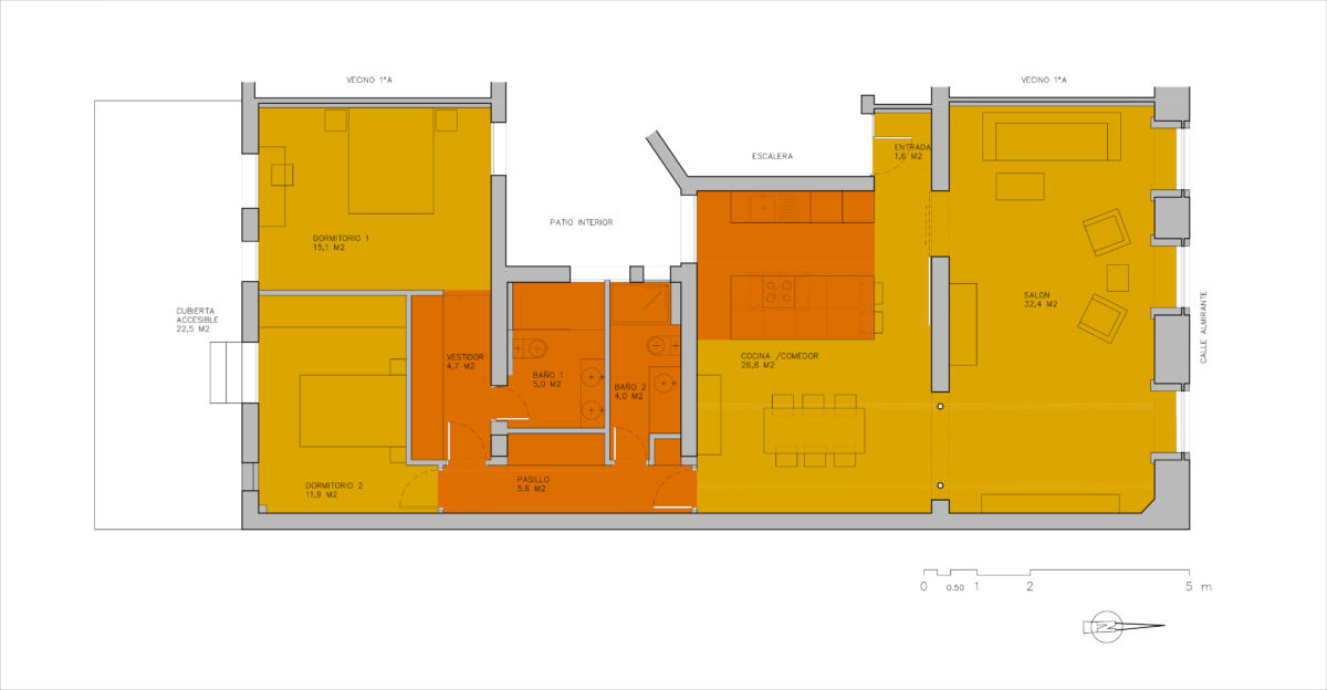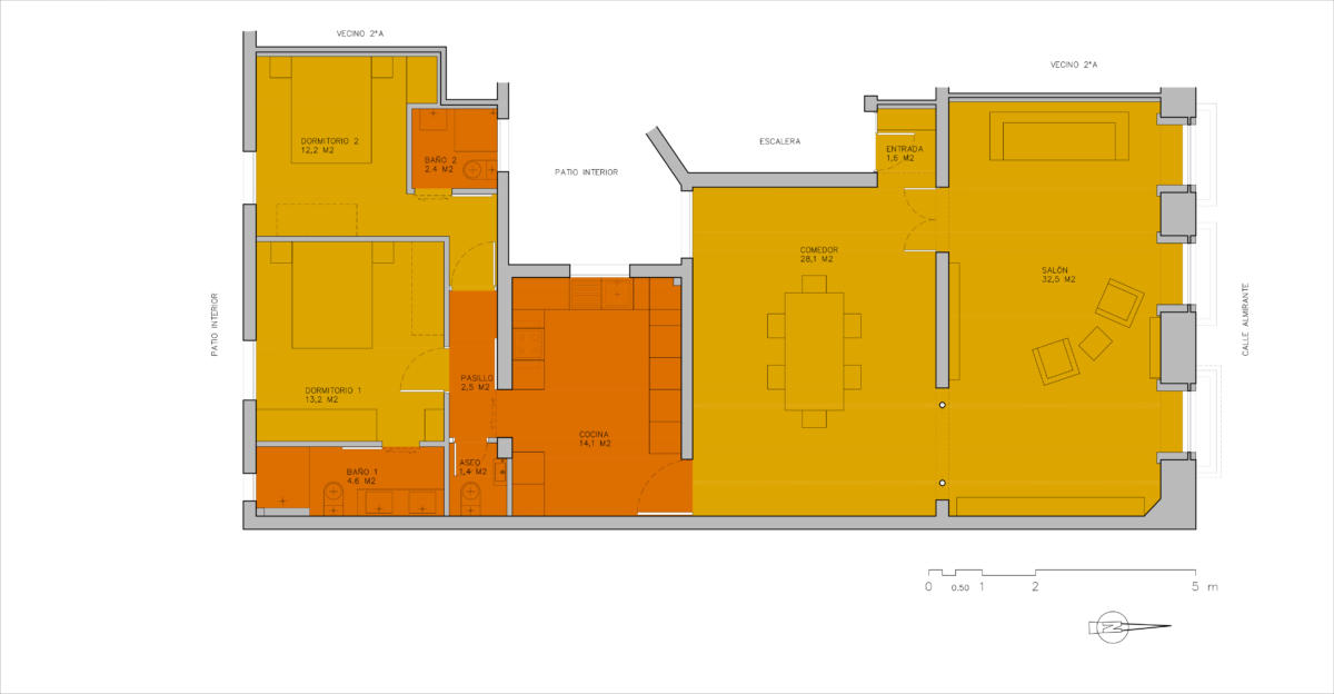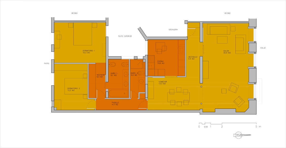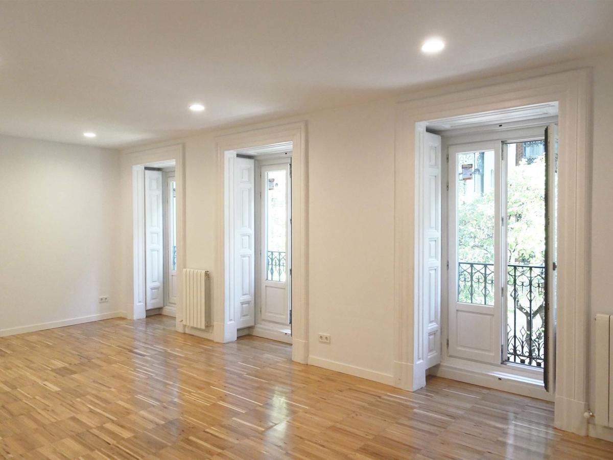 In einem historischen Wohnhaus im Zentrum Madrids wurde im Laufe mehrerer Jahre der Umbau dreier untereinander liegender und fast identischer Wohnungen mit je ca. 130m2 von den jeweiligen Eigentümern in Auftrag gegeben. In allen drei Fällen war das zentrale Thema eine komplette Neuordnung der Räume. Küche und Bäder wurden in der Mitte zusammenfasst und die Wohn- und Schlafräume in einer natürlichen Abfolge angelegt, die es ermöglicht, die Verbindungsgänge weitgehend zu eliminieren. Die hisorischen Elemente an Fassade und Innenräumen werden erhalten und mit einem modernen Raumkonzept und neutralen Oberflächen kontrastiert.