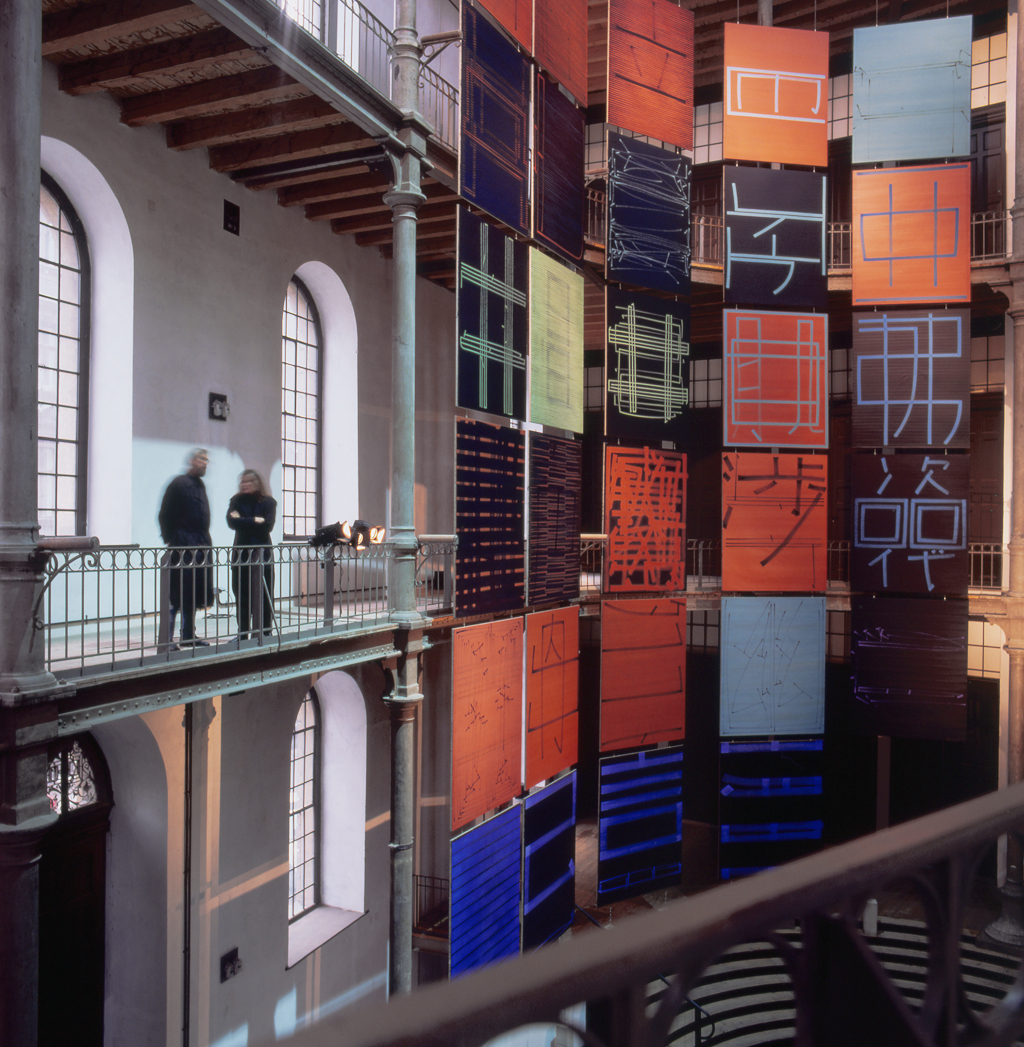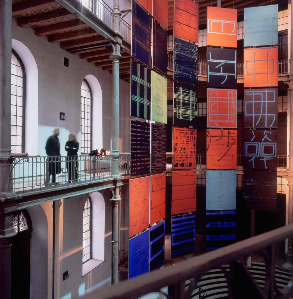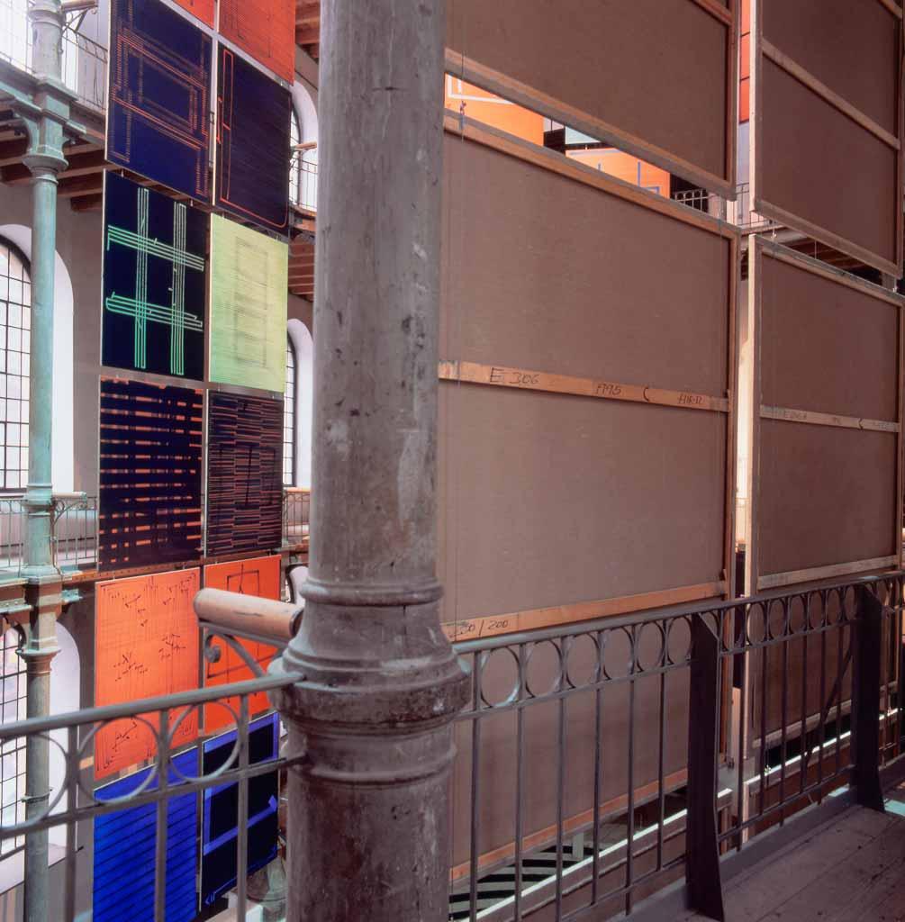 Für die Umsetzung des Ausstellungskonzepts wurden auskragende T-Profile an der bestehenden Struktur der obersten Galerie angebracht, von denen die Bilder an 2mm dünnen Stahlseilen abgehängt werden. Um in dem denkmalgeschützten Gebäude auch auf Fußbodenniveau keine bleibenden Spuren zu hinterlassen, wurden die Seile an ihrem unteren Ende mit Gewichten aus 60kg Sichtbeton stabilisiert. Auf diese Weise entsteht eine Art Raster, das eine von der Saalstruktur unabhängige Hängung der Kunstwerke ermöglicht.
