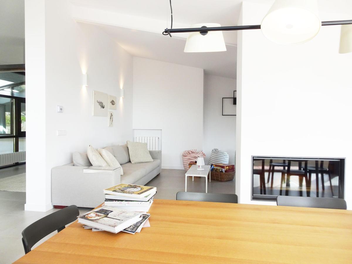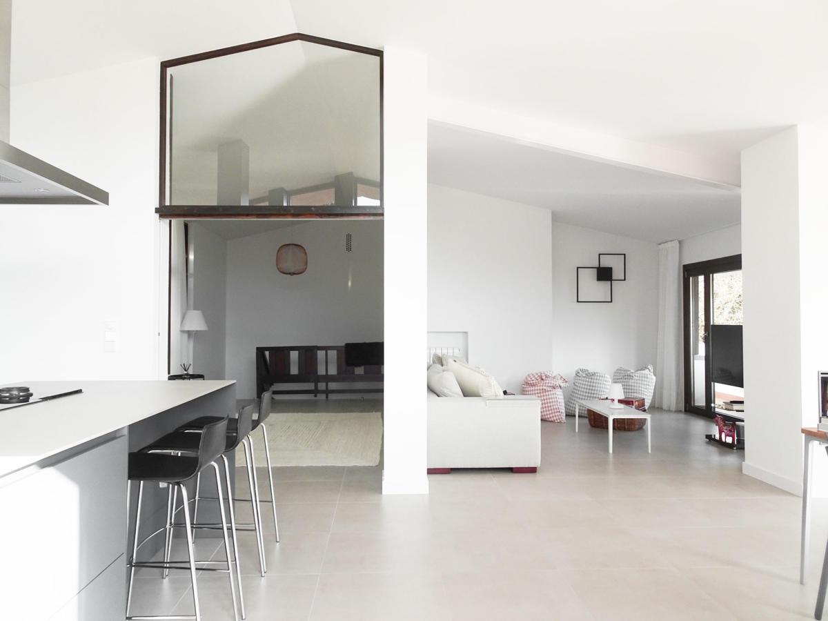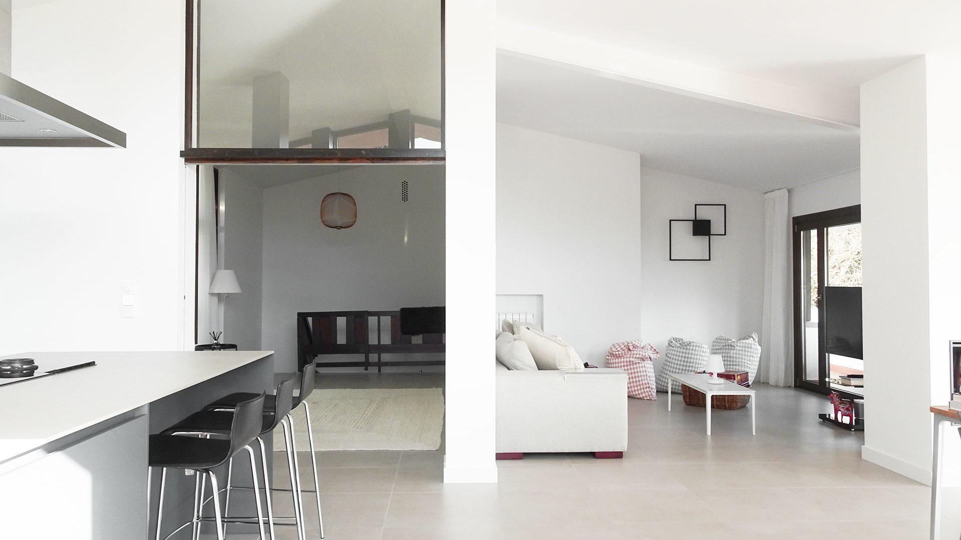 Das bestehende Objekt aus dem Jahr 1962 ist ein Beispiel für die avantgardistische Architektur seiner Zeit und war ein inspirierender Ausgangspunkt für das Renovierungsprojekt. Allerdings waren drastische Eingriffe in das ursprüngliche Raumkonzept nötig, um es für eine zeitgemässe Nutzung als Ferienhaus attraktiv zu gestalten. Der offensichtliche Protagonismus von Ausblick und Lichteinfall bildete dabei ein Grundelement, die Grosszügigkeit und Multifunktionalität der Räume ein weiteres. Um die Küche, ursprünglich hinter dem Eingangsbereich versteckt, in den Wohnraum zu holen, wurde dieser im Rahmen der statischen Möglichkeiten erweitert und von schwerfälligen, rustikalen Elementen aus Naturstein und Holz befreit. Ein doppelseitiger Kamin bildet das Bindeglied zwischen dem Hauptwohnraum und der etwas zurückgezogeneren Sofaecke. Die Wahl eines einheitlichen zementfarbenen Bodenbelags und das luftige Weiss der Wände tragen zu einem lichtdurchfluteten Ambiente bei und betonen die moderne Ästhetik des Hauses.