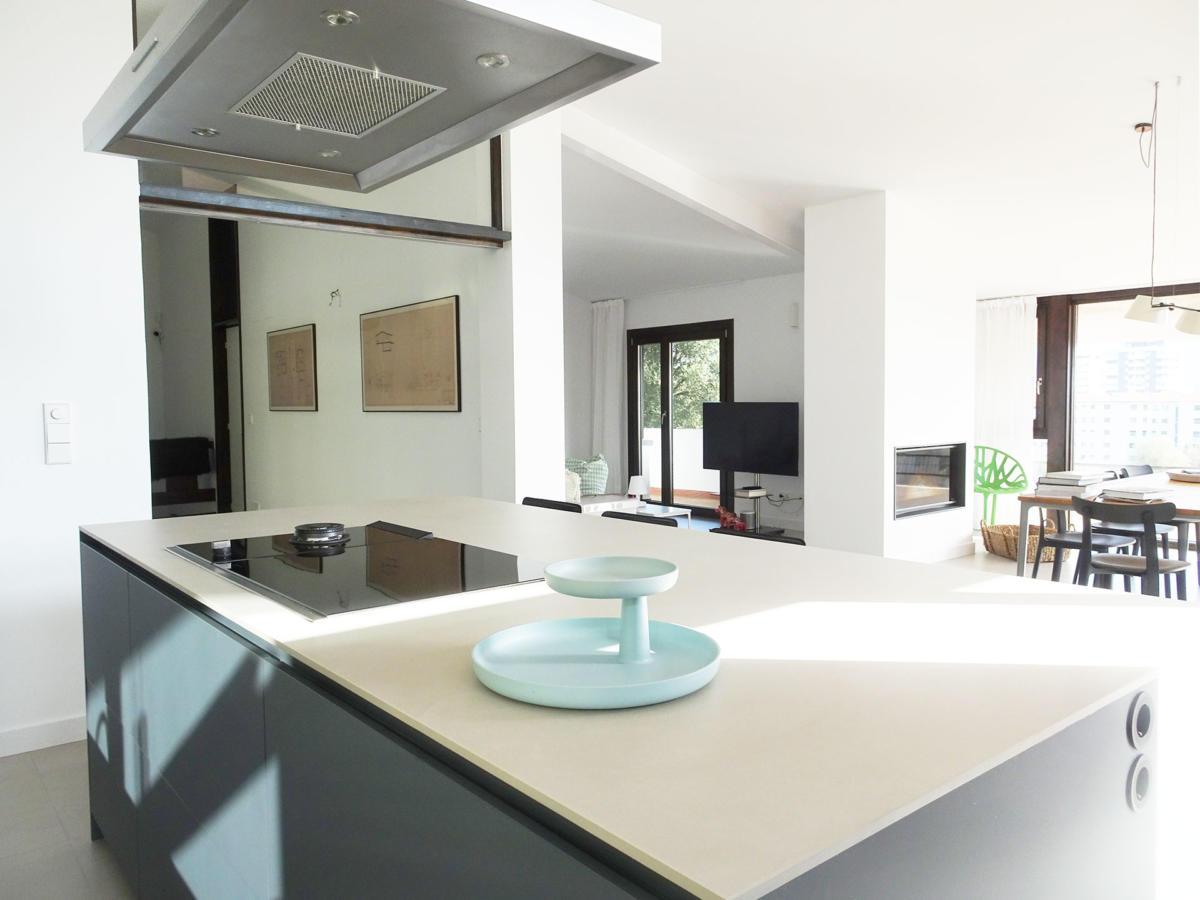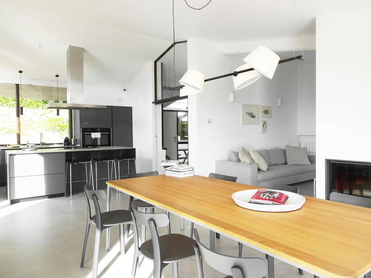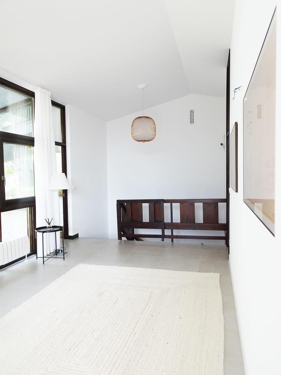 Das bestehende Objekt aus dem Jahr 1962 ist ein Beispiel für die avantgardistische Architektur seiner Zeit und war ein inspirierender Ausgangspunkt für das Renovierungsprojekt. Allerdings waren drastische Eingriffe in das ursprüngliche Raumkonzept nötig, um es für eine zeitgemässe Nutzung als Ferienhaus attraktiv zu gestalten. Der offensichtliche Protagonismus von Ausblick und Lichteinfall bildete dabei ein Grundelement, die Grosszügigkeit und Multifunktionalität der Räume ein weiteres. Um die Küche, ursprünglich hinter dem Eingangsbereich versteckt, in den Wohnraum zu holen, wurde dieser im Rahmen der statischen Möglichkeiten erweitert und von schwerfälligen, rustikalen Elementen aus Naturstein und Holz befreit. Ein doppelseitiger Kamin bildet das Bindeglied zwischen dem Hauptwohnraum und der etwas zurückgezogeneren Sofaecke. Die Wahl eines einheitlichen zementfarbenen Bodenbelags und das luftige Weiss der Wände tragen zu einem lichtdurchfluteten Ambiente bei und betonen die moderne Ästhetik des Hauses.