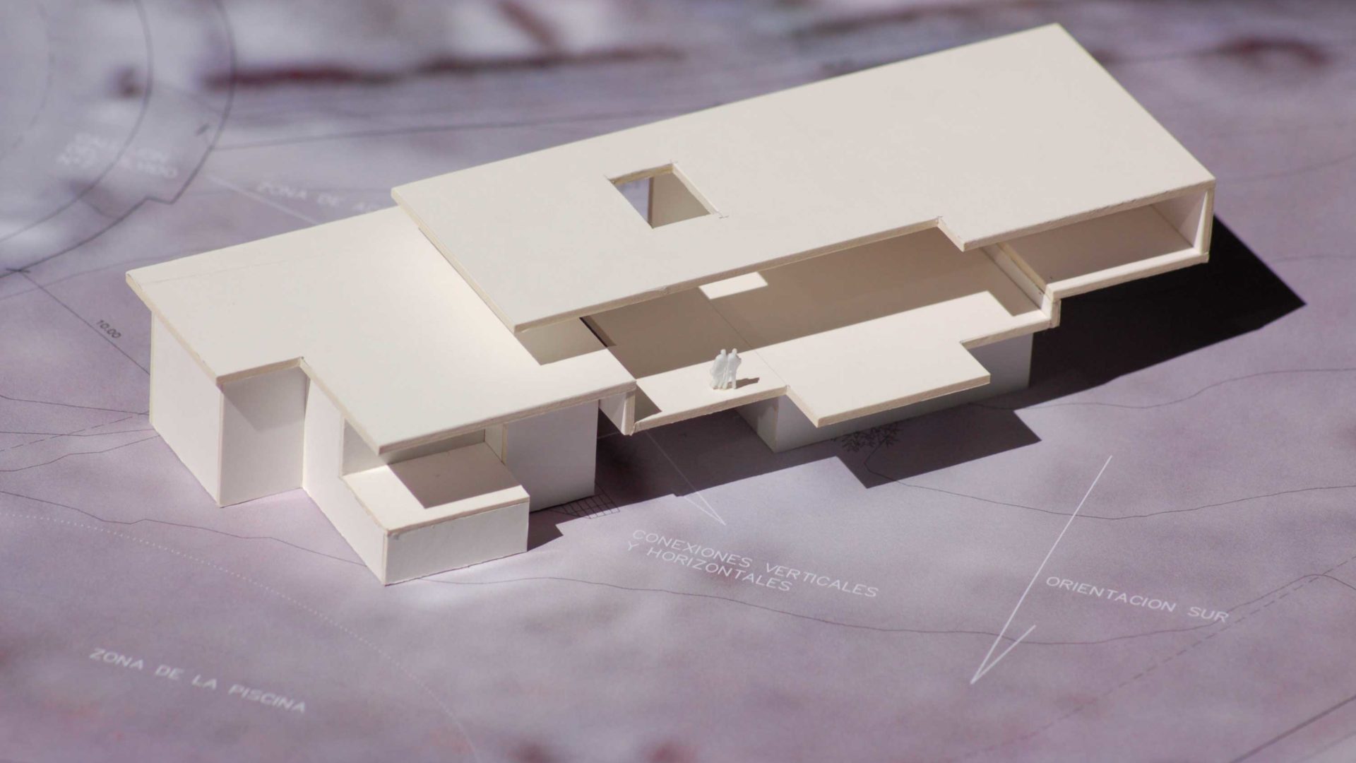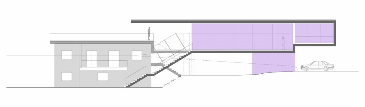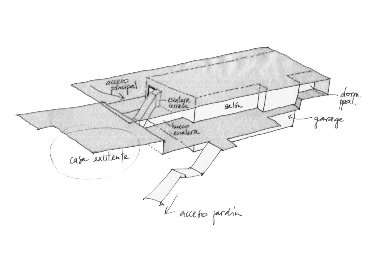 Der Ausgangspunkt für das Projekt war ein existierendes Einfamilienhaus mit ca. 200m2 Größe, dessen sehr konventionell gestaltetes Volumen sich schlecht für eine Erweiterung eignete, auf Wunsch des Bauherrn aber erhalten bleiben sollte. Wir kamen daher zu der Entscheidung, ein neues Haus daneben zu errichten und die beiden ungleichen Einheiten mithilfe eines verbindenden Elements zu vereinen. Es wurde eine Art gefaltete Plattform entworfen, die Basis und Körper des neuen Gebäudes formt und über dam alten Haus eine Terrasse bildet, um das Satteldach zu ersetzen. Im Einklang mit den Bedürfnissen der Familie wurde das Raumprogramm in drei Einheiten unterteilt, die den drei Generationen von Bewohnern gleichzeitig Unabhängigkeit und Zusammenhalt bieten sollen. Als Folge unerwarteter Änderungen in der Familienstruktur verzögerte sich die Ausführung des Projekts und wurde letztlich 2009 in einer reduzierten Form gebaut.