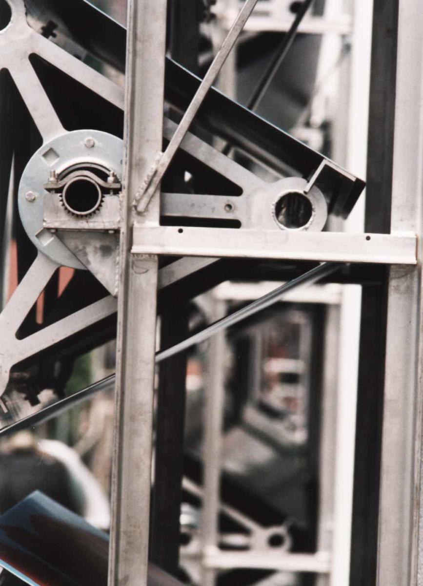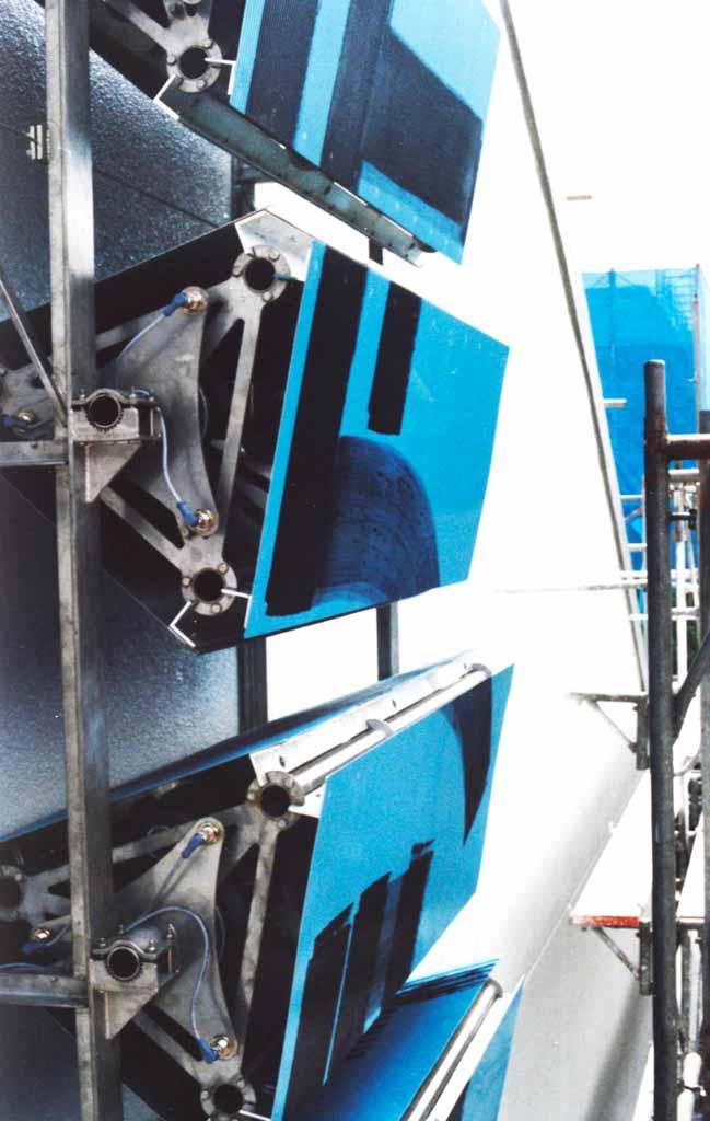 Für die Umsetzung des beweglichen Konzepts wurden prismenförmige Träger aus Stahl angefertigt, deren Achsen von computergesteuerten Elektromotoren bewegt werden. Hintergrund und Trägerstruktur ist die Fassade des ältesten Sportpavillons Japans auf dem Gelände der Universität von Kofu.